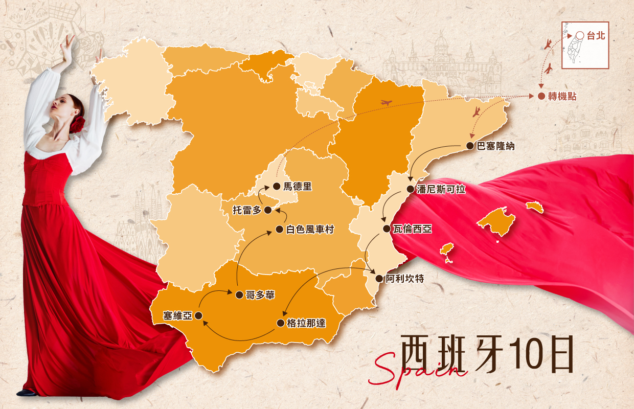 貴賓們今日齊聚桃園國際機場,搭乘豪華客機飛往熱情洋溢的西班牙。這個國度以世界遺產聞名,擁有從摩爾建築到哥德式教堂的輝煌遺跡,也有現代藝術與浪漫風情交織的城市魅力。高第的夢幻建築、歷史悠久的古城、熱情奔放的弗拉門戈與繽紛多彩的節慶,都展現出西班牙獨有的靈魂。這趟旅程將帶領我們穿梭在文化與藝術的殿堂之中,感受陽光、熱情與濃厚的地中海氣息,開啟一段難忘的南歐盛宴。