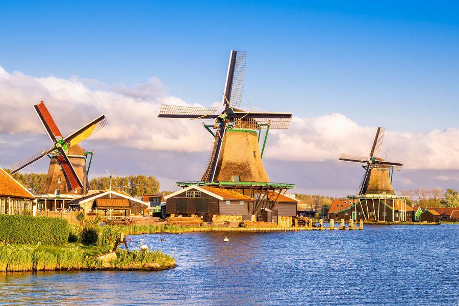 【桑斯安斯風車村Zaanse Schans】是最具代表性的荷蘭傳統聚落之一。沿河分布的多座古老風車仍在運轉,展現17、18世紀荷蘭黃金時期的風貌。村內可參觀木鞋工坊、起司工廠與手工藝店,體驗道地的鄉村文化。綠色木屋、白色窗框與旋轉風車倒映在水面上,如詩如畫,令人彷彿走入荷蘭的經典明信片中。