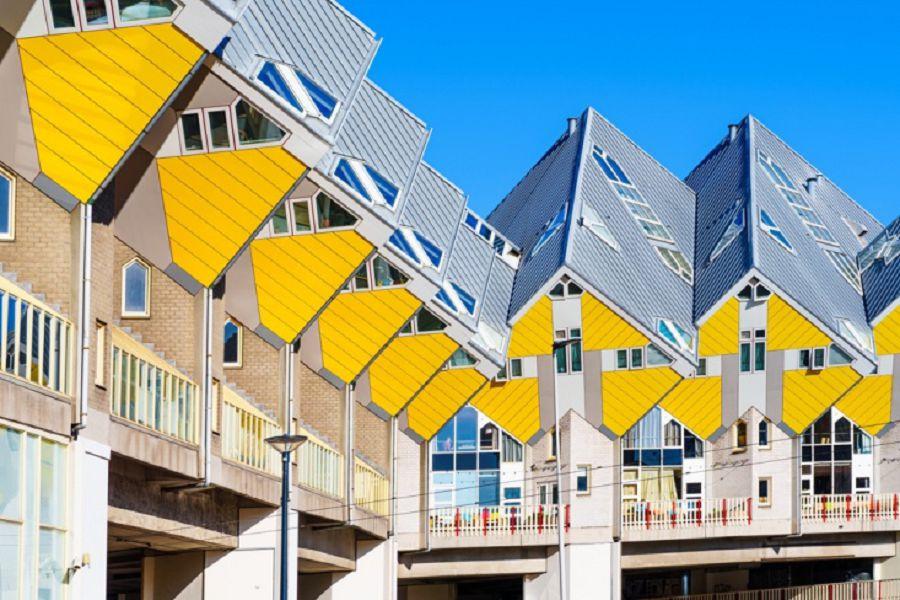 【方塊屋Cube House】是鹿特丹最具代表性的地標建築之一,由荷蘭建築師皮特.布洛姆於1980年代設計。整排房屋呈現獨特的45度傾斜角度,外型宛如一顆顆立在高台上的黃色方塊,構成極富幾何美感的城市景觀。設計理念是「城市中的森林」,每一棟房屋象徵一棵樹,整體則形成一座抽象的森林。