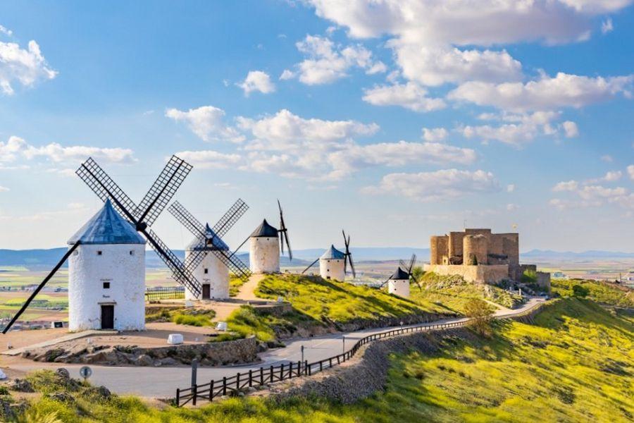 【白色風車村Consuegra】以一排聳立在山丘上的白色風車聞名。這些風車建於 16 世紀,最初用於磨製穀物,如今成為西班牙鄉村風光的經典象徵。據說,這裡的景致啟發了塞萬提斯在《唐吉訶德》中與風車作戰的著名橋段。登上山丘,可俯瞰整個村莊與周邊廣闊的平原,藍天、白牆與風車構成明信片般的畫面。