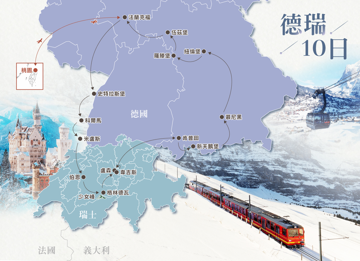 【少女峰Jungfraujoch】被譽為「歐洲之巔」的少女峰,標高3,454公尺,是阿爾卑斯山脈最令人嚮往的夢幻之地。自19世紀以來,這裡便是無數旅人心中的嚮往高地,壯麗雪峰、萬年冰川與藍天白雲交織出令人屏息的絕景。您可漫步於晶瑩剔透的冰宮(Ice Palace),欣賞由冰雕構成的奇幻世界;或登上史芬克斯觀景台(Sphinx Observatory),眺望世界最長的冰河──阿萊奇冰河(Aletsch Glacier),那一望無際的雪白畫卷,彷彿天地間的純淨樂章。