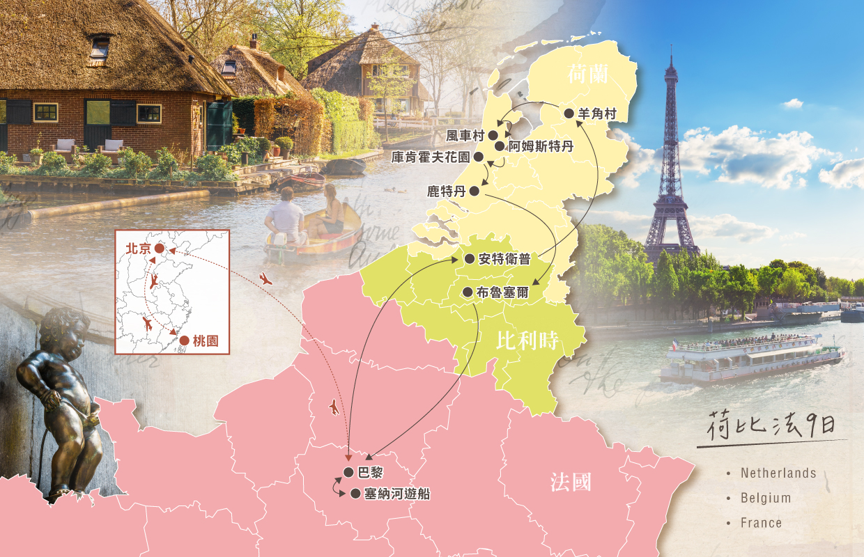 貴賓們今日集合於桃園國際機場,搭乘豪華客機飛往歐洲心臟──法國巴黎。這段旅途將從花都出發,漫遊荷蘭的運河風光、比利時的中世紀古城,最後回到優雅的巴黎。一路欣賞歐洲最動人的景致與建築藝術,體驗各地獨特的文化與生活風情。從繽紛花海到石板街巷,從歷史古都到時尚大道,荷比法以豐富的人文底蘊與浪漫氣息,描繪出屬於歐洲的絕美樂章。