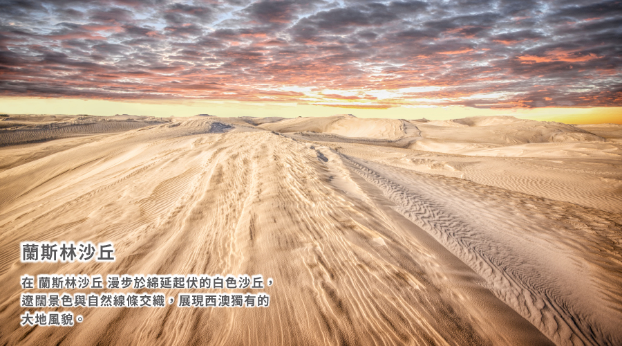 【蘭斯林沙丘Lancelin】位於西澳大利亞綠松石海岸的蘭斯林小鎮是該州保存最完好的度假勝地之一。西澳當地人和國際遊客很快就被其清爽的白色沙丘所吸引。可以在沙丘頂眺望蘭斯林(Lancelin)、四周農地、沙山及海岸線的全景,黎明和黃昏時可欣賞到最佳的美景。沙丘整體約有兩公里長,就位在蘭斯林(Lancelin)城鎮的內陸。