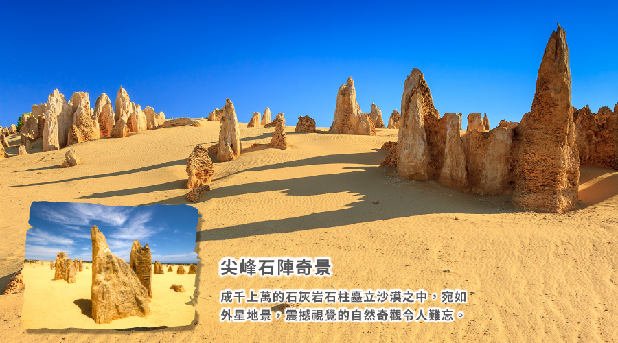 【尖峰石陣Pinnacles】景區沿途風景優美的步行路徑,探索尖峰石陣古老的石灰岩柱。成千上萬的石柱散佈沙漠之中,營造出一種如外星人星球般的神秘地貌。尖峰石陣的石灰石原料來自早期海洋生物的豐富貝類,這些貝殼被分解成富含石灰的沙子,這些沙子被吹向內陸,形成高高的移動沙丘,其歷史可追溯至數百萬年前,當時這裡的沙仍在海底。
