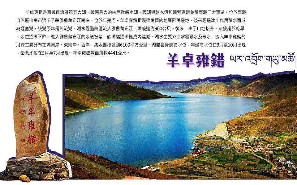 【羊卓雍措】又被稱為羊湖,藏語中意為碧玉湖,位於西藏自治區山南市境內。這個湖泊海拔超過4400米,與納木措、瑪旁雍措並稱西藏三大聖湖,在藏族人心中具有宗教意義。湖水面積638平方千米。羊卓雍措是青藏高原南部最大的封閉性內陸湖泊,湖面海拔4441米,平均深度約23.6米,蓄水量約16立方千米,湖岸線250千米,流域面積6100平方千米,湖水儲量約160億立方米。據當地林業部門觀察測算,羊卓雍措湖鳥島和鳥類數量均為全國罕見。這些島嶼上,均有各種鳥類出沒和棲息。除鳥類外,棲息在羊卓雍措湖流域的野生動物種類極為豐富,哺乳類有雪豹、盤羊、獫痢、水獺、野驢、岩羊、黃羊、獐等國家一、二類保護動物。羊卓雍措是集高原湖泊、雪山、島嶼、牧場、溫泉、野生動植物、寺廟等多種景觀為一體的、獨特的自然風景區,與納木措、瑪旁雍措並稱西藏三大天湖,周圍還有常年不溶的雪山冰峰,最高的達海拔7000多米。湖泊、雪峰與藍天融為一體。