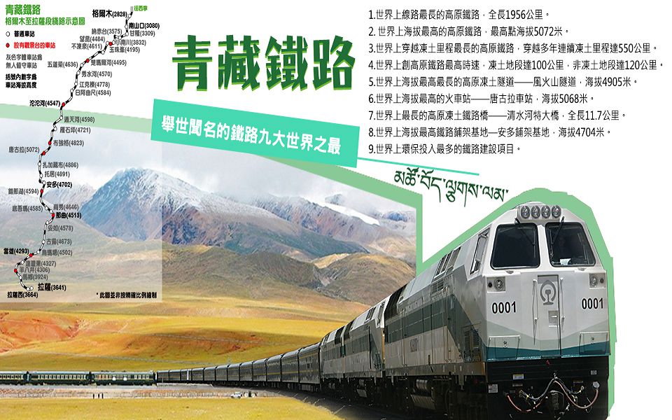 2.世界上海拔最高的高原鐵路,最高點海拔5072米。