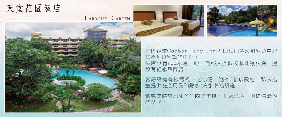 今天來享受一下沒有 Morning Call 叫醒的日子,長灘島的漸層海水,長灘島的綿密白紗,長灘島的夕陽美景,長灘島的紀念品,長灘島的水上活動,長灘島的夜生活都值得你一再品味。