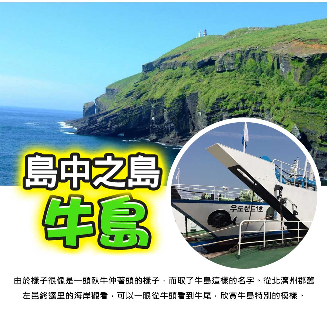 【牛島海洋道立公園(含渡輪船票+島上觀光巴士)】濟州島東部最小的一個島嶼,有珊瑚之島、海女之島、燈塔之島等別名的牛島是多部韓劇《人魚公主》、《連理枝》、《觸不到的戀人》取景之地。整座島嶼狀如臥牛,因此得名牛島。2001年1月1日將島上2個港口(牛島港與下牛牧洞港)週邊與牛島海上一帶25,863㎢的區域指定為牛島海上郡立公園。整體地勢平緩,與海相臨處絕壁陡立。著名的觀光景點包括牛島峰、龍洞、牛島博物館及珊瑚海水浴場,島上觀光巴士依順序繞行。