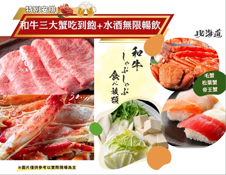 ※備註:若今晚晚餐因客滿或螃蟹缺貨不能享用三大螃蟹吃到飽,則每人退6000日幣改自理餐。