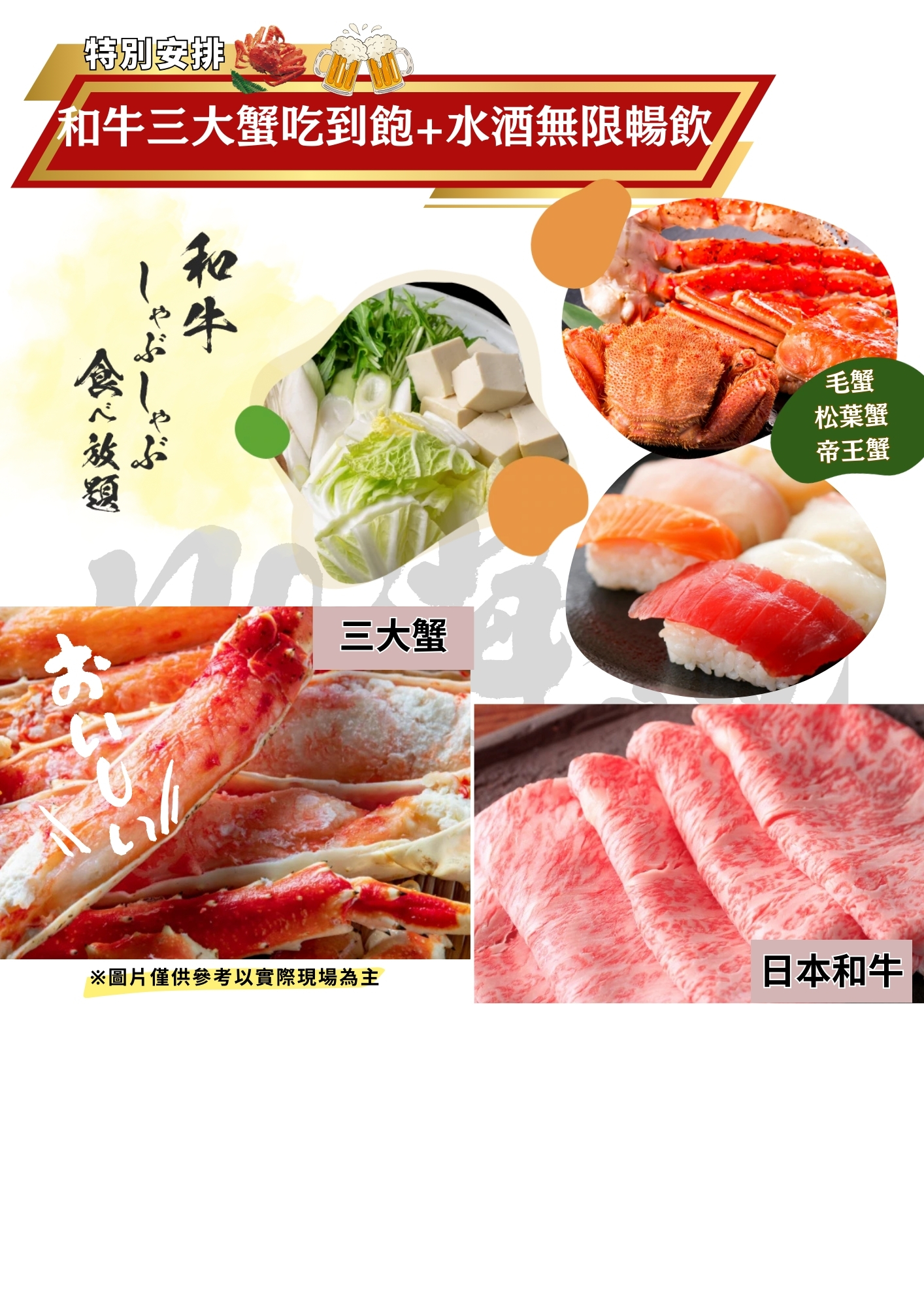 晚餐: 三大蟹+和牛涮涮鍋+酒水無限暢飲吃喝到飽(80分鐘)