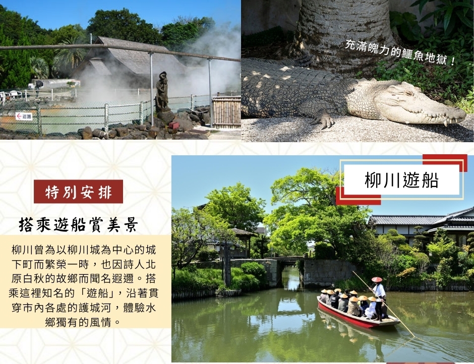 【柳川遊船】一條細長蜿蜒的小河,沿岸花朵、綠樹及紅瓦古建築,古色古香。著名詩人、童話作家北原白秋說《水鄉柳川就是生我的故鄉,是我吟誦詩賦的泉源》,要體會水鄉之美,唯有船伕擺渡式的泛舟巡訪,才能進入白秋詩篇的世界。