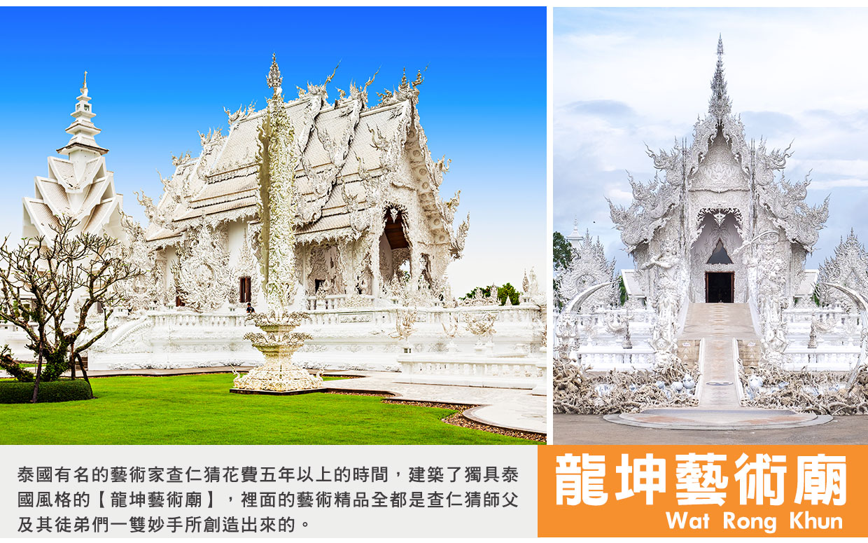 【龍坤藝術廟(白廟)】由泰國名藝術家–查仁猜師父,花五年多時間所建"泰國風格"的龍坤藝術廟,廟的藝術精品全都是查仁猜師父及其徒弟們所創造出來的;廟堂外觀裝飾鏡子碎片,山形窗則裝飾著Nagas(多頭蛇和幽冥世界之神祗 )、大象及傘等形狀。此廟結合傳統與現代創作的藝術塊寶,展現泰國國寶級藝術家的創意,也是此地的新地標。