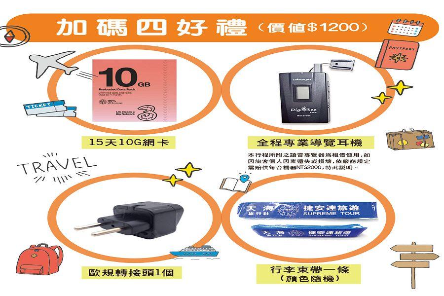 1.歐洲旅遊均為長程航班,建議可自備頸枕或其他須於機上使用之個人用品。