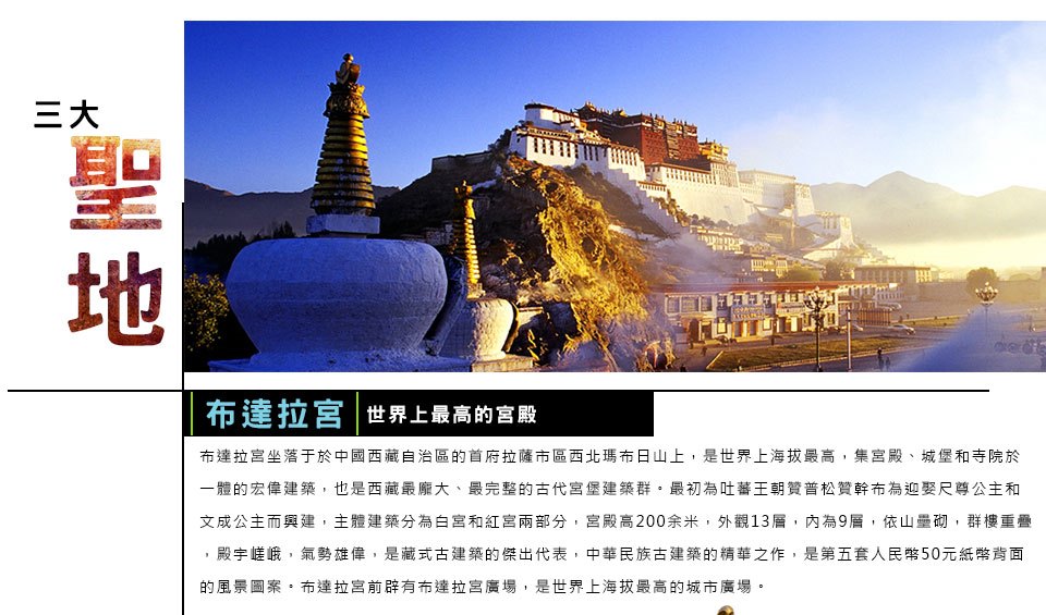 【布達拉宮】位於中國西藏自治區首府拉薩市區西北的瑪布日山上,是一座宮堡式建築群,一說為吐蕃王朝贊普松贊幹布為迎娶尺尊公主和文成公主而興建;另一說為,作為松贊幹布遷都拉薩後的王宮而建。于17世紀重建後,成為歷代達賴喇嘛的冬宮居所,為西藏政教合一的統治中心。布達拉宮的主體建築為白宮和紅宮兩部分。整座宮殿具有藏式風格,外觀13層,實際只有9層。由於它起建於山腰,大面積的石壁又屹立如峭壁,使建築仿佛與山崗融為一體,氣勢雄偉。布達拉宮海拔3700米,占地總面積36萬平方米,建築總面積13萬平方米,由東部的白宮、中部的紅宮組成,主樓高117米。布達拉宮主體建築的東西兩側分別向下延伸,與高大的宮牆相接。宮牆高6米,底寬4.4米,頂寬2.8米,用夯土砌築,外包磚石。牆的東、南、西側各有一座三層的門樓,在東南和西北角還各有一座角樓。宮牆所包圍的範圍全都屬於布達拉宮。 布達拉宮的壁畫、木雕及建築過程中使用的金屬冶煉技術均聞名於世,體現了以藏族為主,漢、蒙、滿各族能工巧匠高超的技藝。 1961年,布達拉宮成為了中華人民共和國國務院第一批中國重點文物保護單位之一。1994年,布達拉宮被列為世界文化遺產。2022年12月,入選2022年11月5A級景區品牌影響力100強榜單。