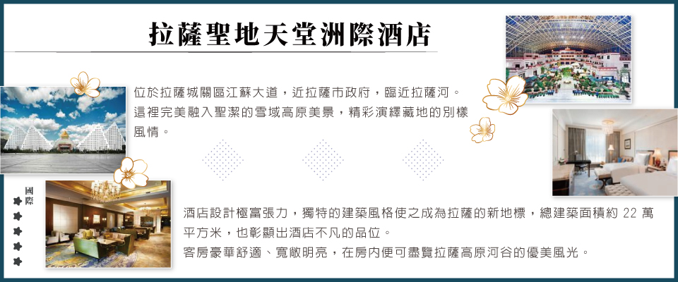 ★貼心提醒:今日由專業領隊帶領貴賓們前往機場辦理登機手續,搭乘豪華客機抵達拉薩,由熱情專業的導遊接待前往餐廳用餐後參觀景點,再前往飯店辦理入住,讓身體適應高原環境,可享受飯店提供的免費設施。