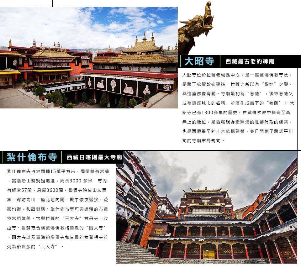 【大昭寺】又名“祖拉康”、“覺康”(藏語意為佛殿),位於拉薩老城區中心,是一座藏傳佛教寺院,是藏王松贊幹布建造,拉薩之所以有“聖地”之譽,與這座佛像有關。寺廟最初稱“惹薩”,後來惹薩又成為這座城市的名稱,並演化成當下的“拉薩”。大昭寺建成後,經過元、明、清歷朝屢加修改擴建,才形成了現今的規模。大昭寺已有1300多年的歷史,在藏傳佛教中擁有至高無上的地位。大昭寺是西藏現存最輝煌的吐蕃時期的建築,也是西藏最早的土木結構建築,並且開創了藏式平川式的寺廟市局規式。環大昭寺內中心的釋迦牟尼佛殿一圈稱為“囊廓”,環大昭寺外牆一圈稱為“八廓”,大昭寺外輻射出的街道叫“八廓街”即八角街。以大昭寺為中心,將布達拉宮、藥王山、小昭寺包括進來的一大圈稱為“林廓”。這從內到外的三個環型,便是藏民們行轉經儀式的路線。大昭寺融合了藏、唐、尼泊爾、印度的建築風格,成為藏式宗教建築的千古典範。寺前終日香火繚繞,信徒們虔誠的叩拜在門前的青石地板上留下了等身叩頭的深深印痕。萬盞酥油燈長明,留下了歲月和朝聖者的痕跡。