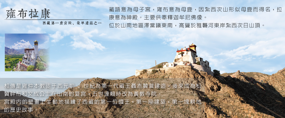 【雍布拉康】藏語意為母子宮,雍布意為母鹿,因紮西次山形似母鹿而得名,拉康意為神殿。雍布拉康是西藏歷史上第一座宮殿,也是西藏最早的建築之一,位於山南地區澤當鎮東南,高聳於雅礱河東岸紮西次日山頂。相傳是雍仲本教徒于西元前2世紀為第一代藏王聶赤贊普建造,後來成為松贊幹布和文成公主在山南的夏宮,五世達賴時改為黃教寺院。雍布拉康主要供奉釋迦牟尼佛像。宮殿內的壁畫上生動地描繪了西藏的第一位國王,第一座建築,第一塊耕地的歷史故事。雍布拉康分為兩部分,前部是一幢多層建築,後部是一座方形高層碉堡望樓,與前部相連。