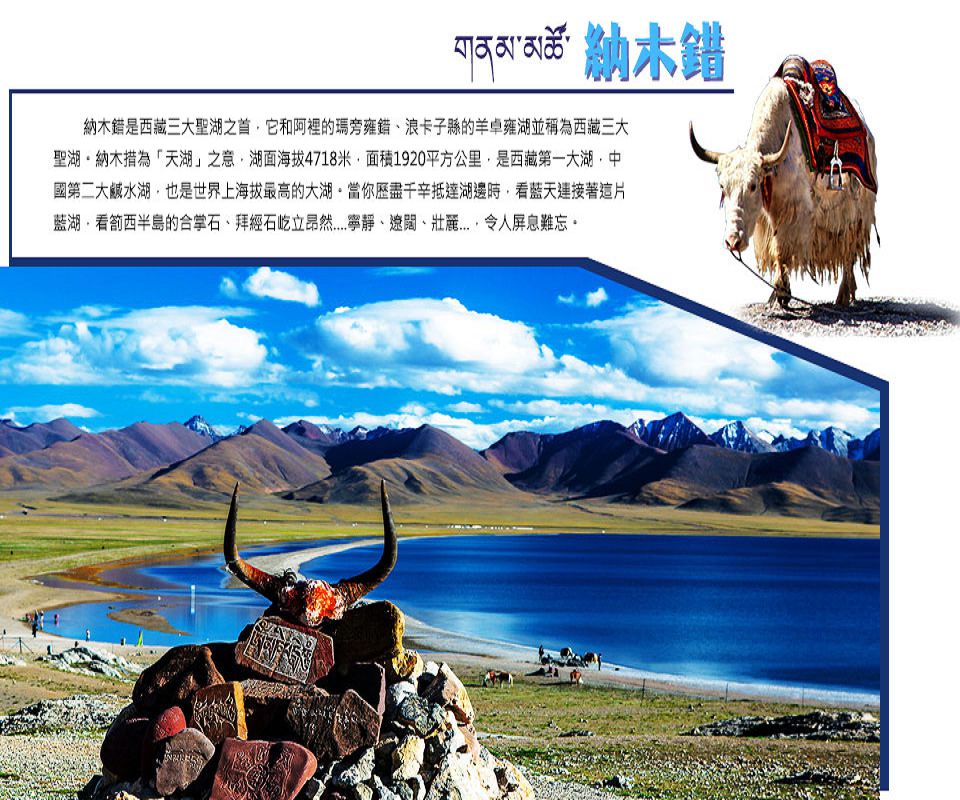 【天湖納木錯(紮西島)】位於西藏自治區中部,是西藏第二大湖泊,也是中國第三大的鹹水湖。湖面海拔4718米,形狀近似長方形,東西長70多千米,南北寬30多千米,面積約1920km瓷C早期的科學考察認為,納木錯的最大深度為33米,但最近兩年對湖泊的重新測量發現,納木錯最深處超過了120米。蓄水量768億立方米,為世界上海拔最高的大型湖泊。“納木錯”為藏語,蒙古語名稱為“騰格裡海”,都是“天湖”之意。納木錯是西藏的“三大聖湖”之一。 納木錯是古象雄佛法雍仲本教的第一神湖,為著名的佛教聖地之一。