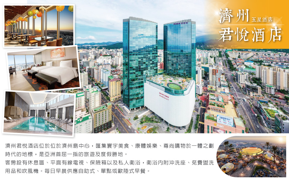 【濟州君悅酒店GRAND HYATT】位於濟州城市之心的地標性雙子建築綜合度假區,渡假區內1,600間客房極具現代設計感、設施設備的雅緻舒適客房及匯集美食、購物、娛樂於一身的君悅酒店躍身成為濟州新地標。您可自由前往【暢遊天城渡假區】匯集全韓超200位時尚設計師的潮流中心、奢華舒適的Jjimjil SPA豪華汗蒸幕、杜鵑水療、童趣中心、天城娛樂場、室內外游泳池、Lounge 38 摩登天際景觀酒吧、咖啡廳、14間多元化風格的高品質餐廳和酒吧等。註:健身房、室內外泳池可免費使用(敬請自行攜帶泳衣、泳帽),其它設施需自行付費。