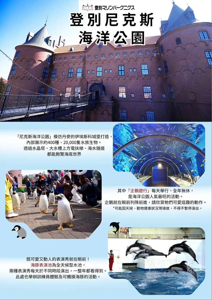 【登別海洋公園尼克斯】主要以丹麥的耶斯克城為藍圖興建而成的尼克城,走在水中隧道,魚兒們就在遊客的頭頂上游來游去,就像走在海底般光影交錯的水中夢幻園,在此魚兒優雅游來游去的水中迴廊,每處都是多采多姿的海中世界。城的四周都是北歐式的街景,還可以看到可愛的海豚精采的表演、國王企鵝遊行、街頭藝人演出等。