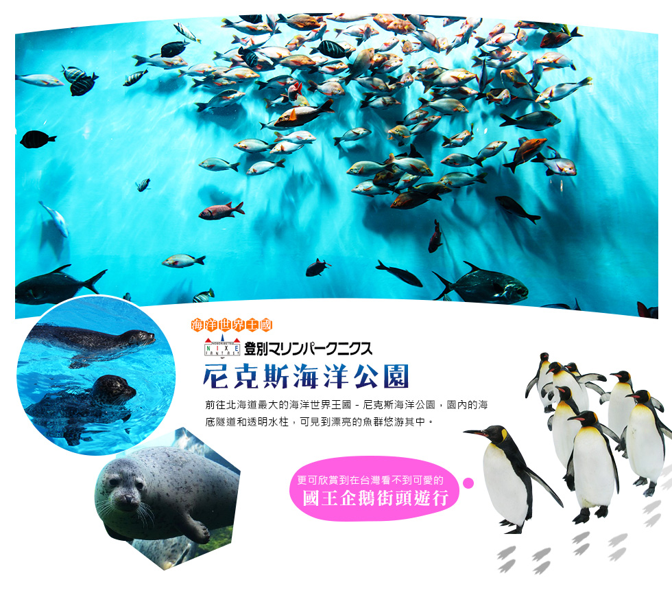 【登別海洋公園尼克斯】主要以丹麥的耶斯克城為藍圖興建而成的尼克城,走在水中隧道,魚兒們就在遊客的頭頂上游來游去,就像走在海底般光影交錯的水中夢幻園,在此魚兒優雅游來游去的水中迴廊,每處都是多采多姿的海中世界。城的四周都是北歐式的街景,還可以看到可愛的海豚精采的表演、國王企鵝遊行、街頭藝人演出等。