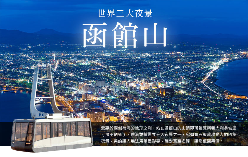 【函館山夜景】來函館旅遊之餘千萬不能錯過函館山的夜景受惠於兩側為海的地形之利,站在函館山的山頂即可飽覽與義大利拿坡里(那不勒斯)、香港並稱世界三大夜景之一,宛如寶石般璀璨動人的函館夜景,美的讓人無法用筆墨形容,絕對實至名歸,讓您值回票價。