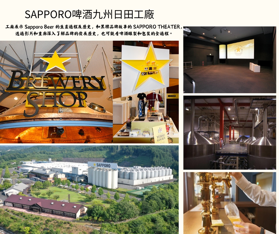 【SAPPORO啤酒九州日田工廠】位於大分縣日田市,成立於2000年,是Sapporo啤酒在九州的主要生產基地。該工廠利用當地優質地下水,生產經典的黑標啤酒(Black Label)及惠比壽啤酒。工廠提供導覽行程,讓遊客參觀啤酒釀造、包裝過程,並能在附設的品酒區享用新鮮生啤酒,、包裝過程,並能在附設的品酒區享用新鮮生啤酒,