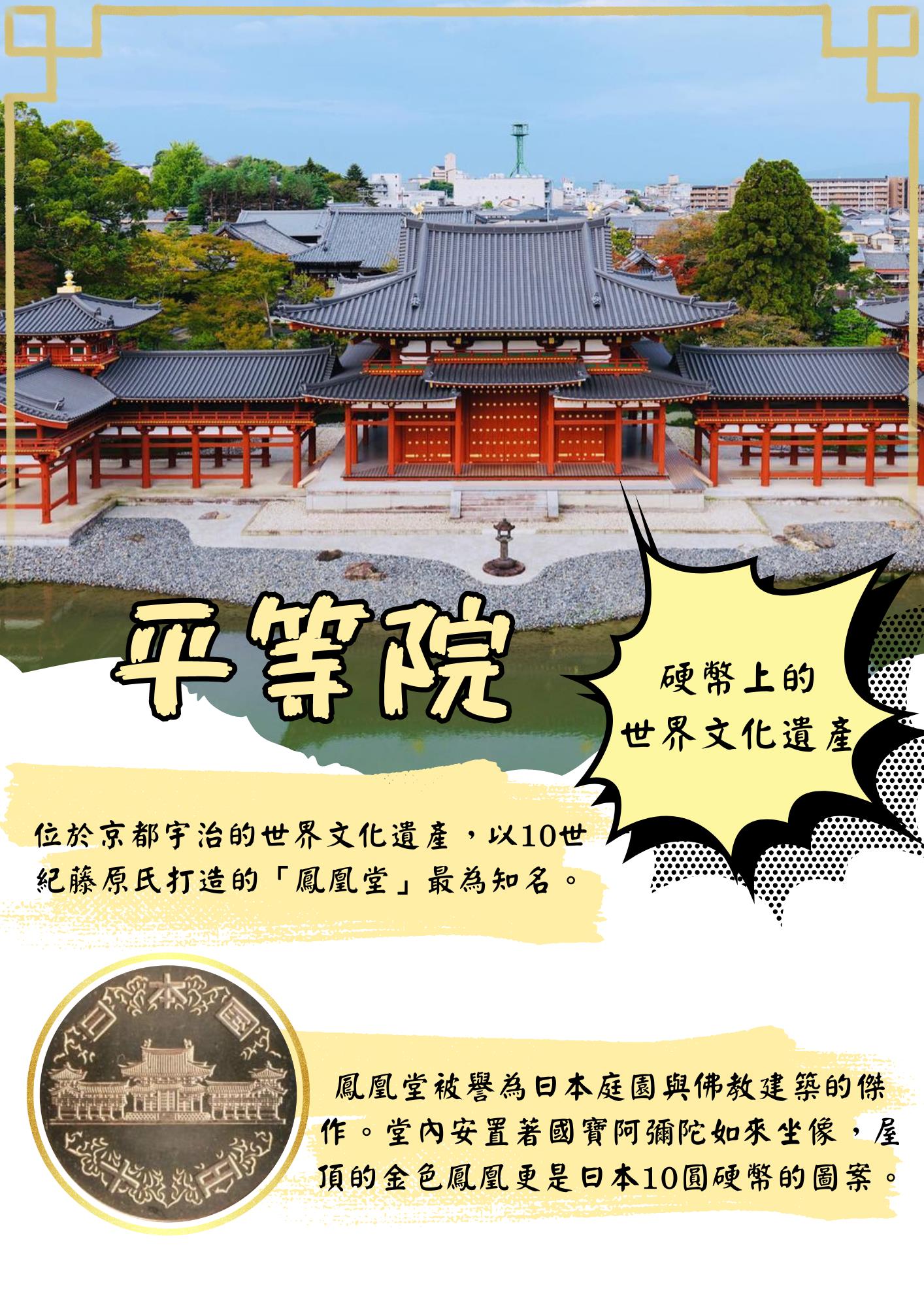 【平等院】由當時的輔政大臣「藤原賴通」將繼承自父親「藤原道長」的別墅改建成佛寺所創建,日本平安時代後期,貴族間流行所謂的「末法思想」,認為世間即將有災禍降臨,故紛紛建造供奉阿彌陀如來的佛堂,讓自己往生後能順利前往極樂世界,境內代表性的建築鳳凰堂,名列世界遺產之一。