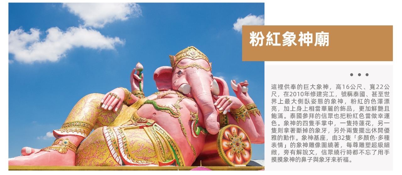 【粉紅象神廟】這裡供奉的巨大象神,高16公尺、寬22公尺,在2010年修建完工,號稱泰國、甚至世界最大側臥姿態的象神,粉紅的色澤漂亮,加身上相當華麗的飾品,更加鮮豔且飽滿。泰國參拜的信眾也把粉紅色當作幸運色。象神的4隻手當中,一隻持著蓮花,另一隻則拿著斷掉的象牙,另外兩支擺出休閒優雅的動作。象神基座,由32隻「多顏色、多種表情」的象神雕像圍繞著,每尊雕塑超級細緻,旁有解說文,信眾繞行時都不忘了用手摸摸象神的鼻子與象牙來祈福。