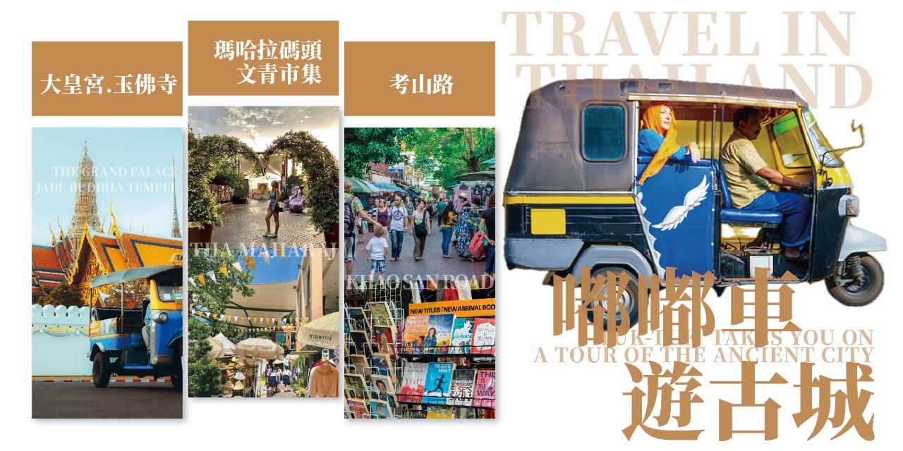 搭乘泰國的特色交通工具【嘟嘟車遊老曼谷】,是有著棚子的三輪摩托車,行進中一邊吹風一邊欣賞當地的沿途景色暢遊曼谷老城區,悠閒逛古蹟及各大熱門景點。 (車遊外圍,不入內參觀)