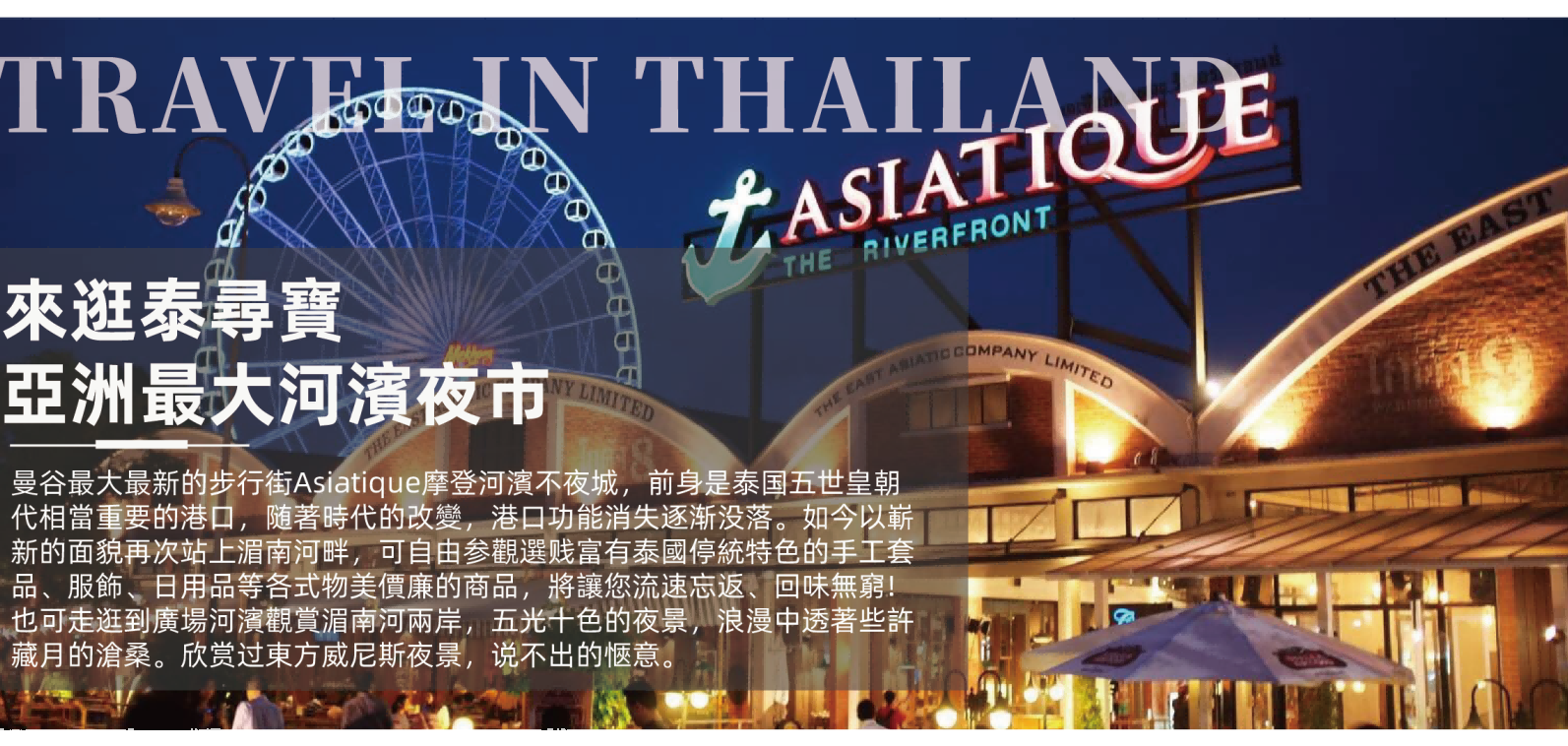 【全新亞洲夜市】佔地4.8公頃的Asiatique河濱碼頭夜市,每天營業,共有1500個大小不一的商家,屬於歐美造景風融合泰式文創風的現代商圈,有好看的泰拳秀、人妖秀,還有蠻多美食餐廳、商店、按摩館、伴手禮店、曼谷包、BKK包,怕錢帶不夠也有Super Rich可以換泰銖。